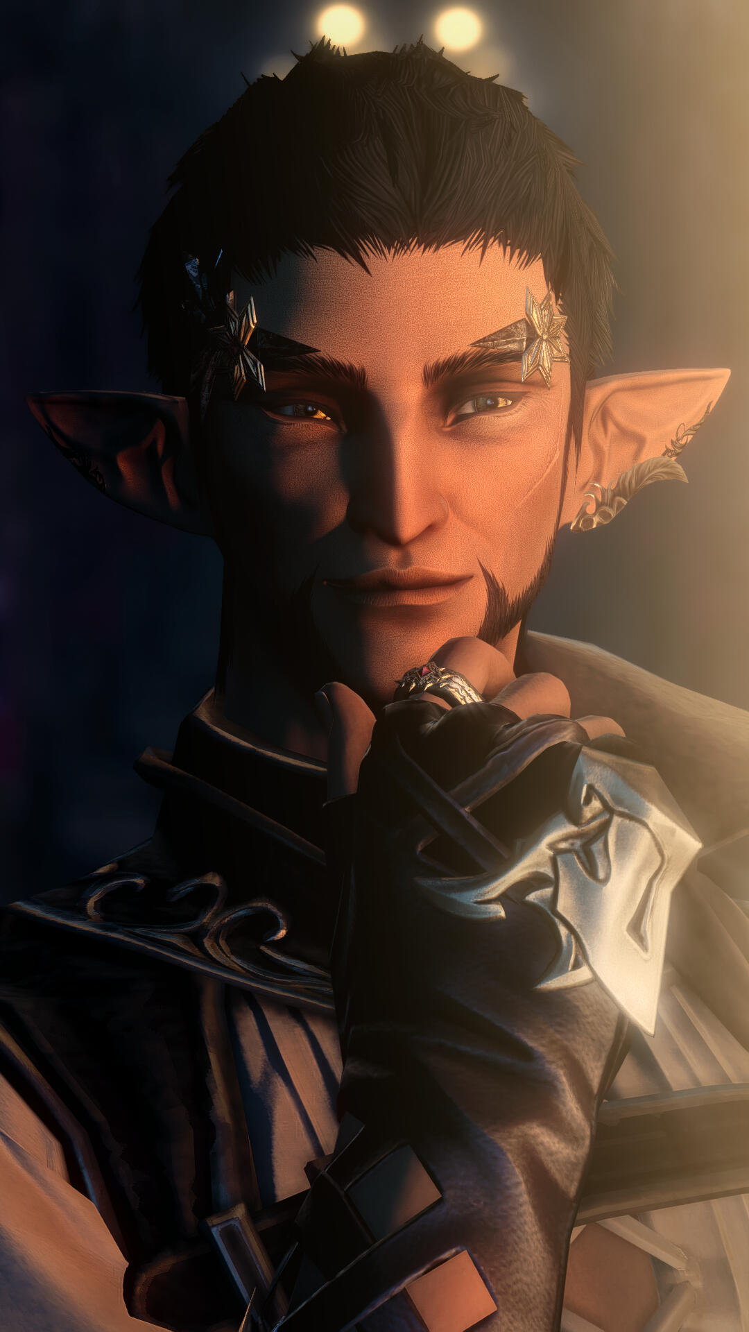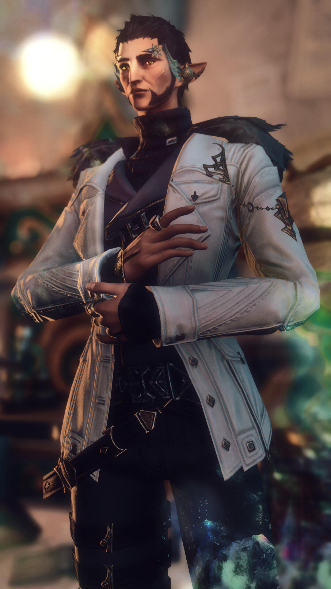 somewhere just beyond the cusp of middle age, kai's impressive height is undercut by his gangling build and easy manner to rob his silhouette of any intimidating factor. he wears his dark hair short, though never short enough--it resists all attempts at neatness to lie in shaggy ruffles about his crown. his beard and goatee he has better luck with, and keeps well-groomed.the backs of his hands are marked, each in kind, with the blood-red ink of a sharlayan sage's tattoo or archon mark; the one upon his right hand is slightly more feathered and aged than that upon his left. those hands are soft, seemingly unused to any toil harder than thumbing tomes or writing treatises. his body likewise lacks any telltales of physical combat, though an aging scar splits his left cheek, faded to pale against the warm brown of his skin.he tends to dress in monochrome, in multiple layers--the sharlayan clime is changeable and libraries are often cool and dry for the sake of conserving the tomes they house. he seemingly prefers accessories of gold: ear cuffs and rings, cuff links and tacks all feature at least occasionally, but quite often he wears a pair of stylized aigrettes resembling leaves or blossoms at his temples. what honor they might signify he does not say, more focused, perhaps, on the way they compliment the rich gold of his eyes.his posture is easy and his manner louche, not given to the stiff formality expected of either an elezen nor a sharlayan scholar. he has a ready smile, an easy laugh, and an accent native to nowhere he's ever claimed as home.